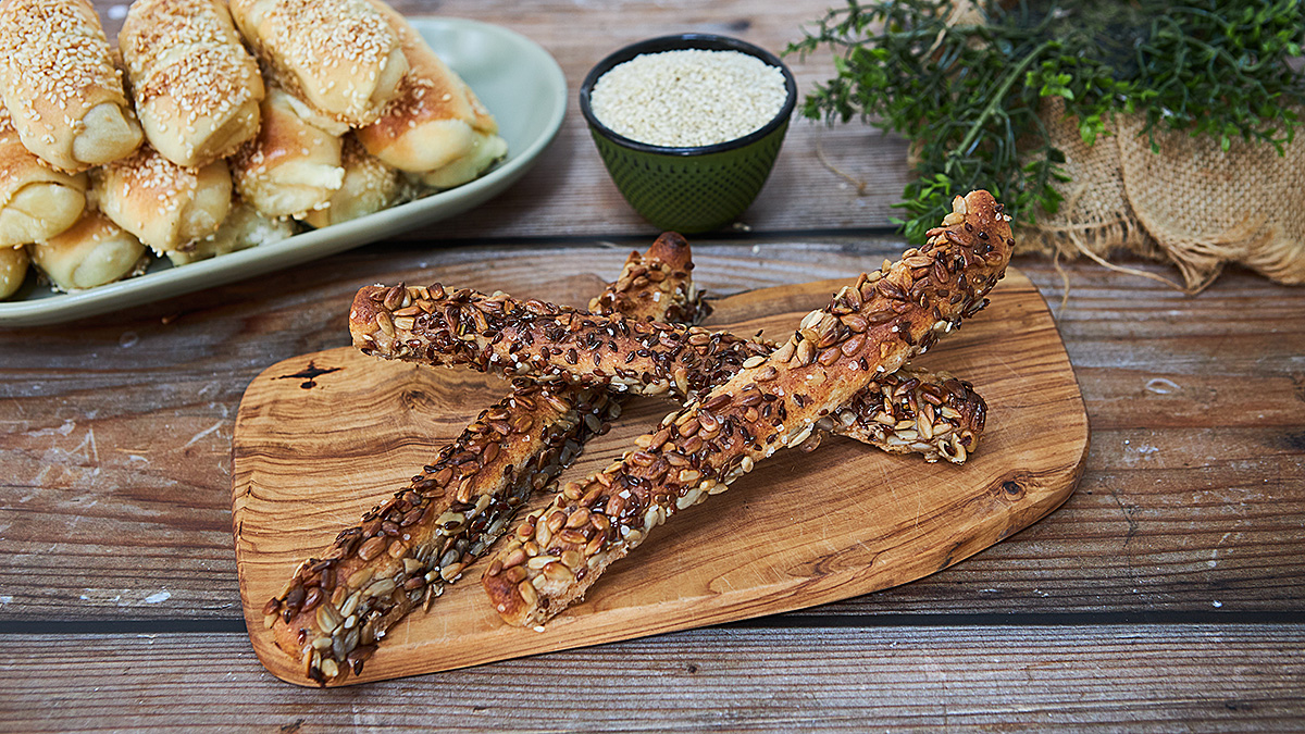 Štapići od integralnog brašna, posuti semenom lana, suncokretom, posuti krupnom morskom spli i premazani maslinovim uljem