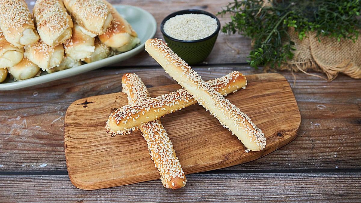 štapići sa dodatom majčinom dušicom u samo testo, posuti sucokretom, krupnom morskom solju i premazani maslinovim uljem
